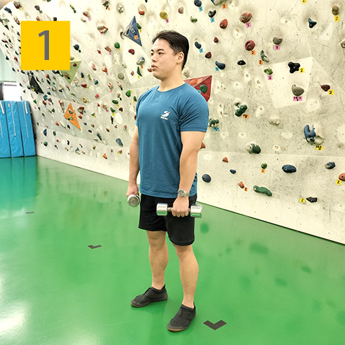 ① 足を腰の幅くらいに広げて立ち、両手にダンベル(重り)を持つ。 |