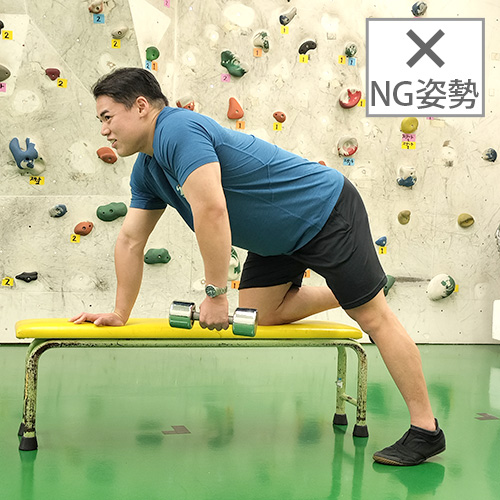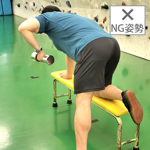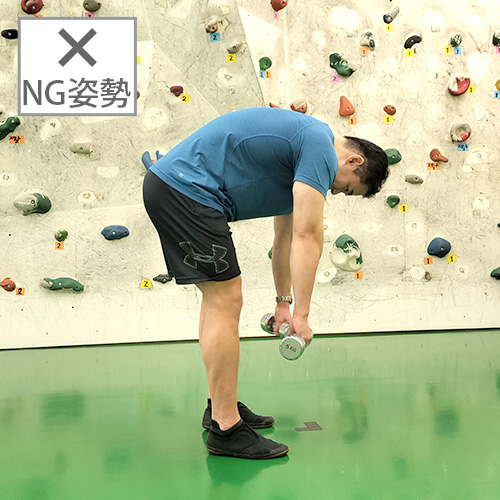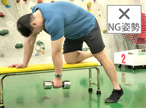 NG3 引き上げる時にダンベルが腰から離れている。肝心の背中に負荷がかかりにくい。 |