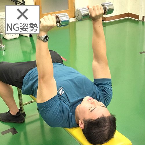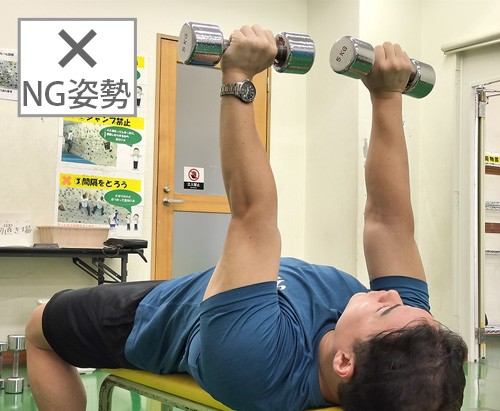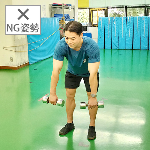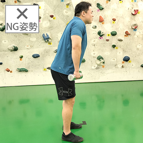 NG2 ダンベルを身体から離して持つ。腕、腰に負担がかかってしまう。 |