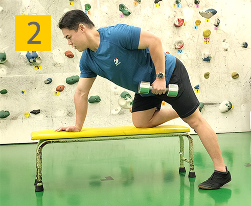 ① 片手でダンベル(重り)を持ち、反対側の手とひざをベンチに乗せる。上体は一直線に保つ。 |