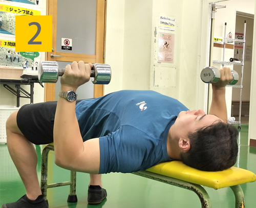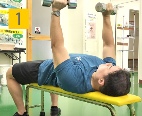 ① 両手でダンベルを持ち、ベンチの上で仰向けになる。ダンベルは肩の上に来るように持つ。 |
