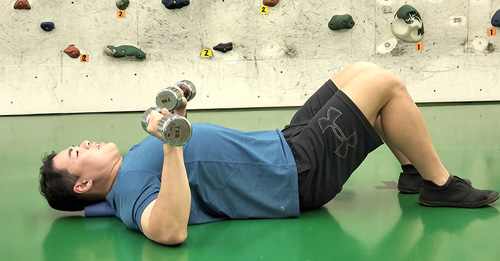 ① 仰向けになり、ひざは90度曲げて足を床につける。両手で額の前でダンベルを持つ。 |