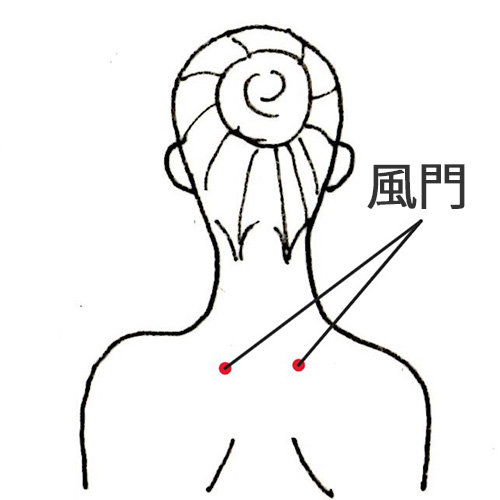 | ② 低温やけど予防のため、肌に直接貼らず、衣類の上から貼ってください。風門の位置を特定できなくても、だいたい背中の上の方、首すじの根本より少し下がったあたりに貼れれば大丈夫です。 |