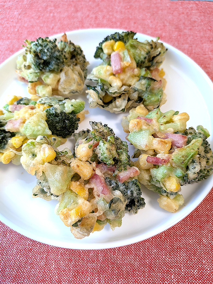 ![]() ■ 材料(2人分) 1人分 407kcal ブロッコリー(茎や葉を含めて)…約150g ホールコーン缶…50g ベーコン…2枚 衣 卵(小)…1個 牛乳…大さじ1 オリーブ油…大さじ1/2 塩…ひとつまみ カレー粉…ひとつまみ 薄力粉…40g