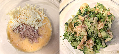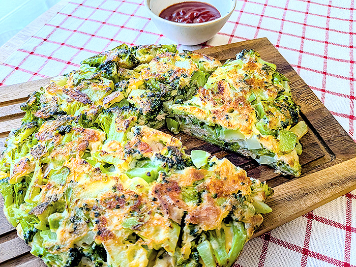 ![]() ■ 材料(2人分) 1人分 387kcal ブロッコリー…1個(250g程度) 片栗粉…大さじ1 a 卵…小2個 ツナ油漬け缶…1缶 溶けるチーズ…50g オリーブ油…大さじ1 b ケチャップ…大さじ2 タバスコ…好みで 数滴