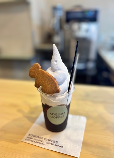 毎朝、その日によって豆を変えドリップされたアイスコーヒー(今日はブラジルでした)に、たっぷり乗ったほんのりコーヒー味の自家製ソフトクリーム。お店のキャラクターのこぐまのクッキーが添えられています。ソフトクリームは濃厚なのに甘すぎず、さっぱりとした味わいでおいしい!