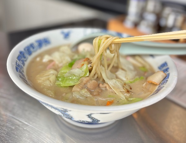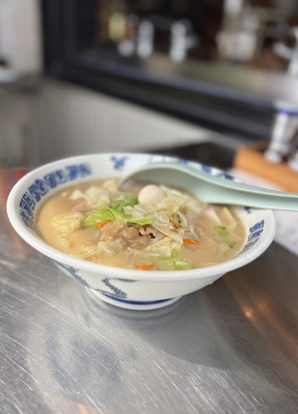 コラーゲンたっぷりの濃厚でコク深いスープに、野菜や海鮮、豚肉などの具材がたっぷり。かつて柴崎町にあった名店から受け継がれたちゃんぽんの味と当時のお店を知る人にとって、この大きなレンゲは懐かしい!