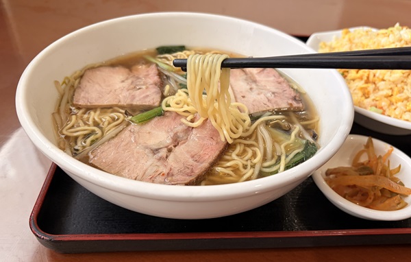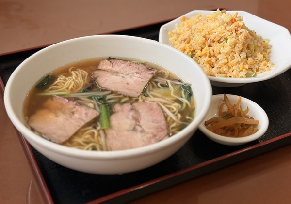 チャーシューや小松菜が入った、五香粉が香る本格的な中華ラーメン。本場中国のラーメンはこういう味なのかなぁと想像しながら、そして、パラパラに炒められた炒飯は、添えられたザーサイと共においしく頂きました。