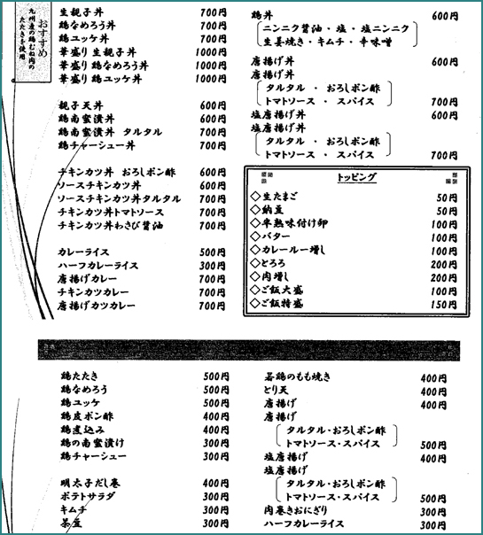 新鮮な九州産の鶏むね肉のたたきを使用した生親子丼やチキンカツ等の鶏料理の数々。