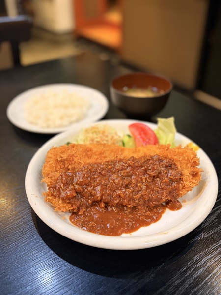 テーブルに運ばれてきてビックリ! 想像していたサイズと違う~! お皿が小さく感じる程の大きなチキンカツは、衣がカリッと揚げられています。中はとても柔らかく、玉ねぎの入ったデミグラスソースがたっぷりかけられています。
