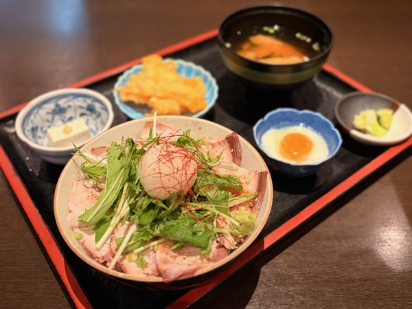 軽く炙ったぶりのお刺身の上に大根おろしと水菜が乗っていて、そこに温泉たまごを落として頂きます。
