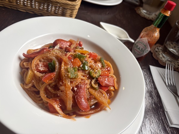 カラフルナポリタンは濃厚なソースにもっちりとした麺が良く絡み、パプリカ、ピーマン、玉ねぎ、ウインナーが沢山入っていて食べ応えがあります