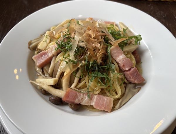 きのことベーコンと大葉のパスタは厚切りベーコンに舞茸、しめじが沢山入っていて大葉の上にさらに鰹節がのっていて、バター醤油の絶妙なおいしさ。2人とも無言であっという間に間食。