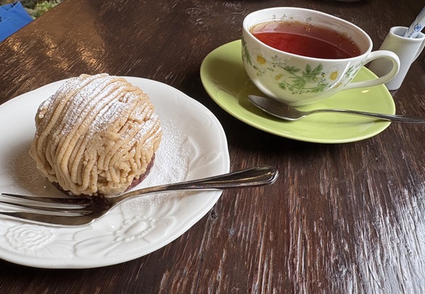 食べ終わると、1号の元にはモンブランと紅茶が。モンブランは国産の栗と砂糖、バターだけで作ったクリーム、中はメレンゲとバニラクリームでできているとのこと。一口食べると栗のクリームとふわふわのメレンゲが口の中で溶けていきます。紅茶と良く合う!
