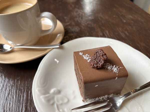 2号はココカフェショコラとコーヒー。ココカフェショコラはココナッツミルクたっぷりのチョコレートケーキにコーヒーが隠し味になっていて、周りにコーティングされたチョコとのバランスも良く、チョコ好きの私にはたまりません。