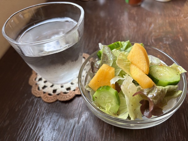 サラダは丁寧にお野菜がカットされていて甘い柿も入っています。サラダに合う!目から鱗!家でサラダを作る時に真似してみようっと。