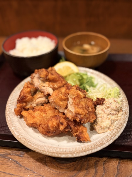 しっかり味のしみ込んだ竜田揚げは、カラッと揚がって外はカリッと中はジューシー。 添えられたタルタルソースやレモンで、味変を楽しみながら頂きます。 そのタルタルソースには鰹節が入っていて、竜田揚げだけでなくご飯にも合う!