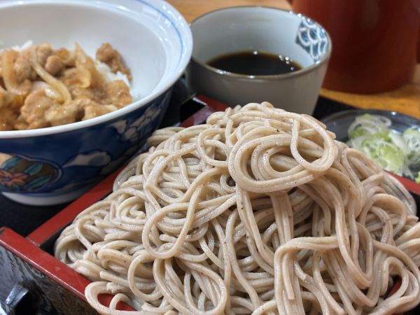 お蕎麦は温かいお蕎麦、冷たいお蕎麦を選べますが、この日は季節外れのポカポカ日和で、冷たいお蕎麦を、そしてセットのごはんは豚丼にしました。