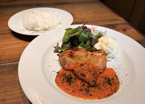 パリッとローストされたチキンにクリーミーで酸味のあるトマトソースがよくからんでおいしい!