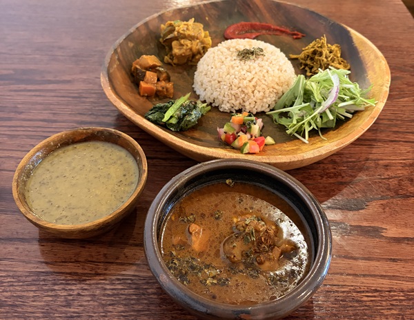お店の方から「まずは左のダール(豆のスープ)をそのまま少し味わって、その後、そのダールをごはん(土鍋で炊いた五分づき玄米)に混ぜ込み、さらに上からチキンカレーをかけてお召し上がりください。最後には周りの副菜もすべて一緒に混ぜ合わせて味の変化をお楽しみください」と丁寧に説明していただきました。