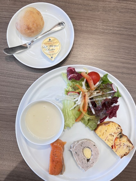 オードブル3種に、彩り野菜のサラダ、スープ。