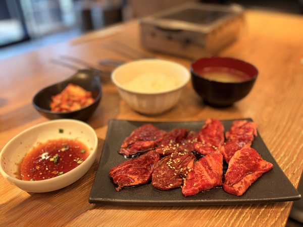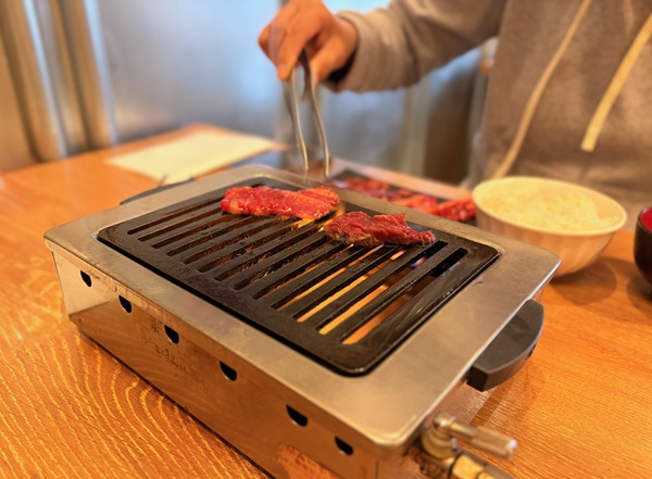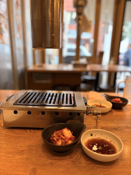 ロースターで焼くのですぐに焼き上がり、焦げすぎないように注意しながら黙々とほおばる。そして、こちらのキムチがなんとも美味しくて、辛すぎずシャキシャキしていて、お肉を食べたあとの口の中をリセットしてくれます。お肉、キムチ、ご飯が進みすぎるー。