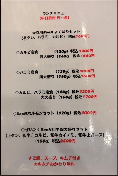 はらぺこコンビ、やっぱり2種類食べたいよねってことで、「カルビ、ハラミ定食120グラム(1,200円)」を注文。ご飯は大、中、小から選べます。スープとキムチもついてきます。