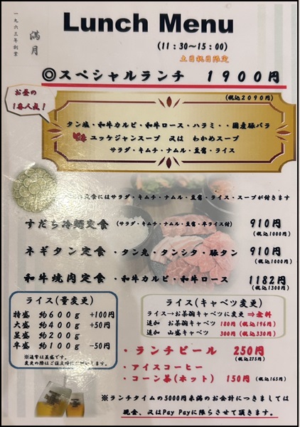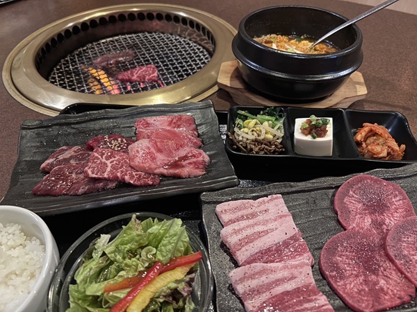 タン塩・和牛カルビ・和牛ロース・ハラミ・国産豚とスープ、これにサラダ、キムチ、ナムル、豆腐、ライスが付いて税込2,090円って、どうなっちゃってるの?と思うほどのボリューム。