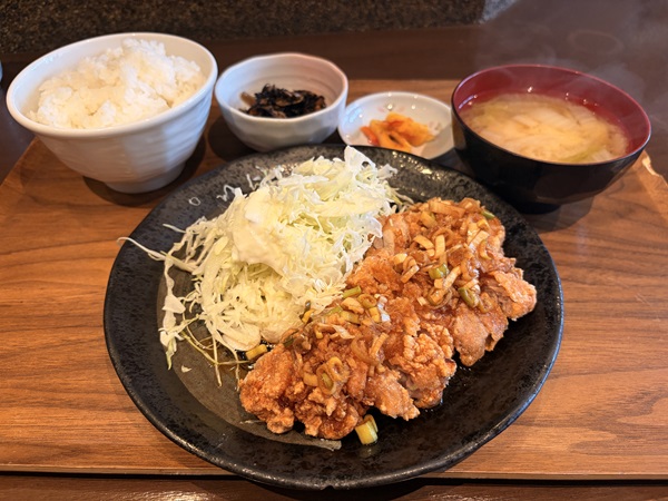揚げ立て熱々のカリッと揚がった鶏肉にネギや生姜が効いた甘酸っぱい香味ソースがたっぷり。これだけで十分ご飯が進みます。添えられた小鉢のひじきの煮物と白菜、豆腐の入ったお味噌汁はしみじみおいしいホッとする優しい味わいでした。