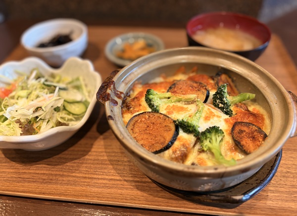 じっくり煮込まれた牛スジは、舌の上でとろけるほどの柔らかさ。食べ進むうちに感じるじんわりとした辛さをトロトロのチーズと半熟卵で和らげます。焼きナスとブロッコリーの香ばしさがおいしさを引き立てています。