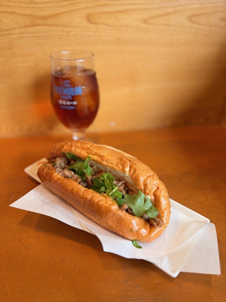 外はカリッと中はふんわりと焼き上げられたフランスパンに、甘辛く味付けされた豚焼肉と大根と人参のなます、きゅうりやパクチーがたっぷり挟まっています。絶妙な特製ソースがすべての具材と合わさって食べ終えるのが惜しく感じるほどです。