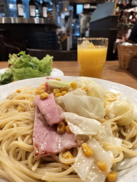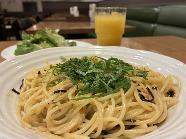 店頭の案内板にラインナップされていた大葉と昆布の、日替わりランチに惹かれ入店するも、生姜風味、バター風味。肉味噌、お醤油味など、日替わりランチ以外に70種類以上ある、豊富なパスタメニューはかなりの魅力でしたが、初志貫徹。日替わりランチ(¥1,200 税込)をお願いすると…
