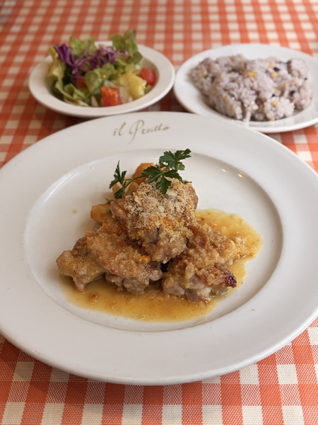 2号が選んだメニューは本日の肉料理「大山鶏(鳥取県ダイセン産)もも肉のパン粉焼き フレンチマスタード風味(1,300円)」サラダとパン(自家製フォカッチャ)、ライス(16雑米)から選べ、こちらもサラダ、カフェがセットになっています。