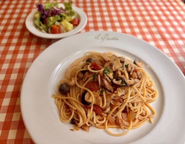 はらぺこ1号が「私これー!」と選んだメニューは本日のパスタ「キノコと鯖の完熟トマト煮スパゲッティ(1,200円)」サラダ、カフェセット。