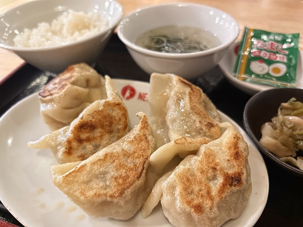 皮が厚めでカリッと焼き上げられた餃子は、旨みたっぷりの餡がぎゅっと詰まっていて、食べ応えあり! 定食はお味噌汁や小鉢もついて、ご飯少なめでも大満足のボリュームです。