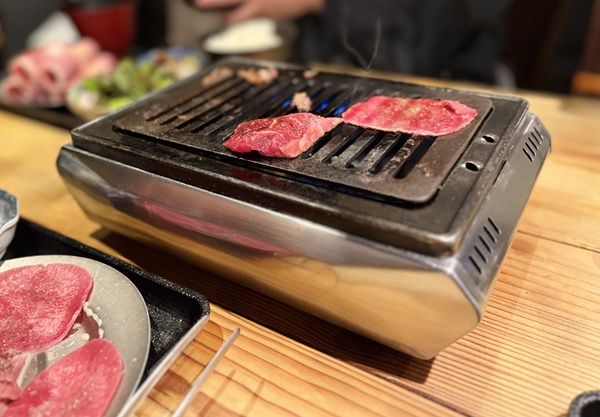 ロール状の牛肉を広げながら焼き、甘辛い割下の入った濃厚な卵黄へくぐらせて頂きます。焼いている途中、脂身に火がついて勢いよく燃え上がるシーンも…これぞ焼肉の醍醐味ですよね(笑)。