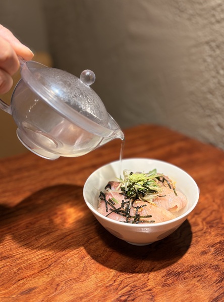 芳醇なごまだれを絡めたブリと鯛のお刺身を堪能した後は、温かいお出汁を注ぎます。