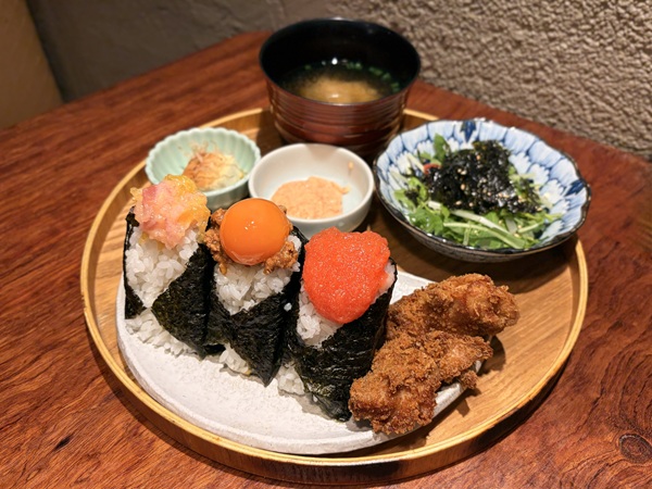 小皿に入った明太マヨネーズはカリッと揚がった唐揚げに付けたりおにぎりに足したり、楽しみ方は自由自在!とろろ昆布入りのお味噌汁、韓国のりの入った水菜のサラダ、冷ややっこもご飯のおいしさを引き立ててくれて大満足。