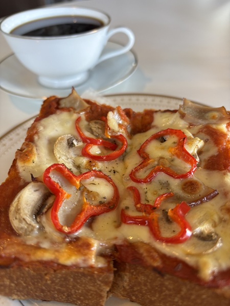 厚みのあるトーストは焼き加減も絶妙で、パンのふわっと感も残っているので、パンの美味しさが良く分かります。その上にトマトのうまみが広がるソース、マッシュルーム、ベーコン、パプリカ、たっぷりチーズがトッピング。チーズはとろっとしつつも糸を引くように伸び、いやー美味しい。。