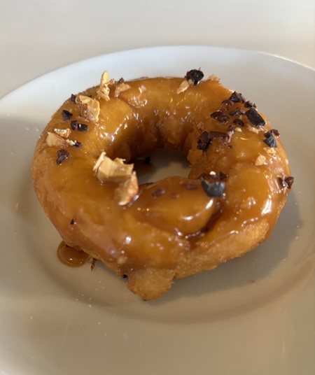 食後の良いタイミングで揚げたての塩キャラメルドーナツが登場。甘すぎないキャラメールコーティングされたドーナツはなかはもちふわ、外はカリッとしていて、塩がキャラメルのコクを引き立てます。トッピングのクラッシュアーモンドも良いアクセント。コーヒーに合うー!