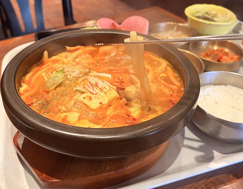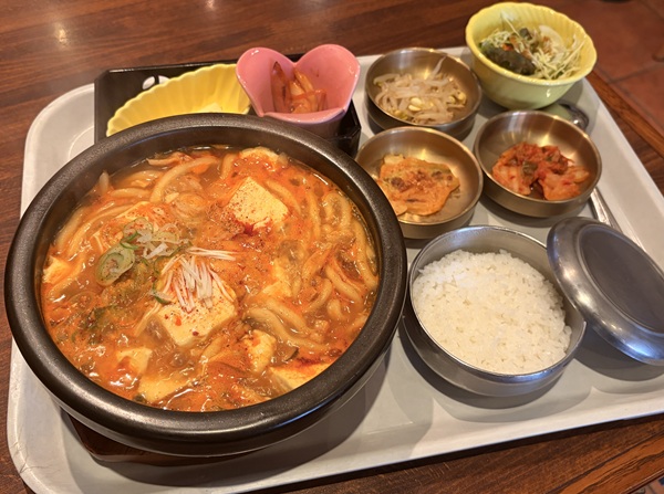 グツグツと煮え立つスープを一口飲むと、海鮮の出汁が口いっぱいに広がります。アサリ、きのこ、お豆腐がたっぷりと入ったチゲに、ツルツルとのど越しの良いうどんが相性抜群!麺をいただいた後は、残ったスープにご飯を投入。これがまた、旨味をすべて吸って絶品。