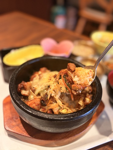 「タッ」というのは韓国語で鶏肉のことだそうで、その名の通り鶏肉がゴロゴロと贅沢に入っています。添えられたコチジャンを混ぜ合わせると、器の底には香ばしい「おこげ」が!