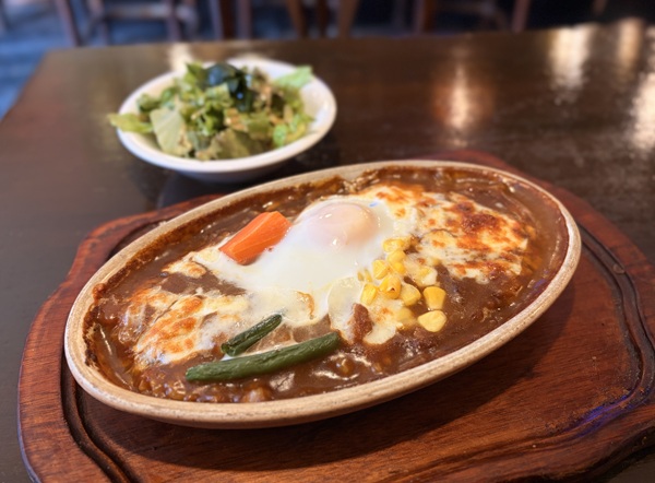 オーブンでじっくり焼き上げられたカレーは、まさに熱々!とろけるチーズと卵に加え、コーンや人参、インゲンがトッピングされています。 食べ進めるうちにじんわりとスパイスの辛さが広がり、途中で卵の黄身を割れば、マイルドなコクが加わって絶妙な美味しさでした。