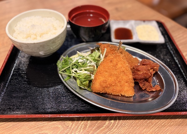 サクサクに揚がった大きなアジフライ2枚と唐揚げが1個付いています。添えられた玉子の食感がおいしいタルタルソースと中濃ソースの両方で味わいました。