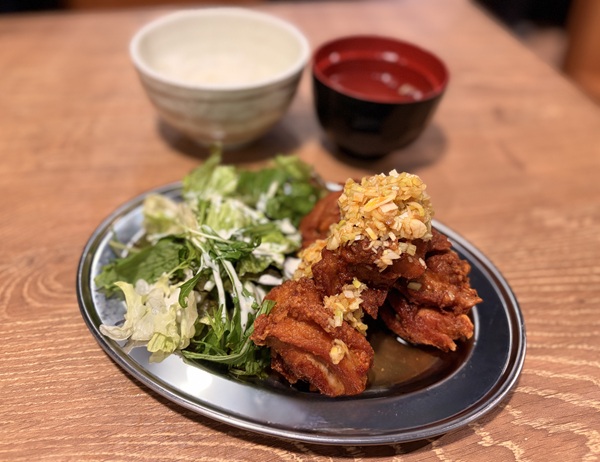 甘酸っぱいネギだれがかかった唐揚げは、衣のカリカリ感と身のジューシーさが絶妙なバランス。大きな唐揚げが揚げたて熱々の状態で提供されるので、最初の一口は火傷に注意です。