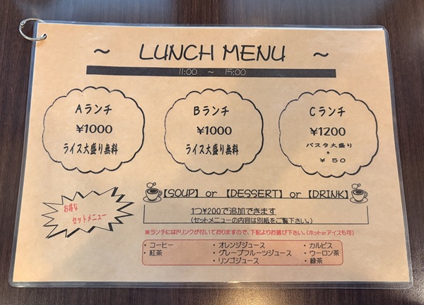 全てのメニューにドリンク(8種類の中から選択)付き